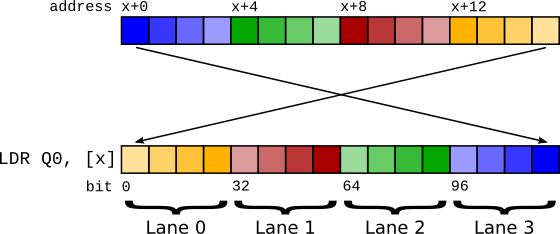A vector is a consecutive sequence of items that are operated on simultaneously. To load a 64-bit vector, 64 bits need to be read from memory. In little-endian mode, we can do this by just performing a 64-bit load - LDR q0, [foo]. However, if we try this in big-endian mode, because of the byte swapping the lane indices end up being swapped! The zero’th item as laid out in memory becomes the n’th lane in the vector.