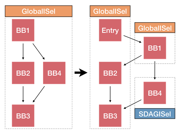 This can prevent some optimizations as GlobalISel is generally able to work on a single function at a time. This technique can be repeated for different combinations of basic blocks until you have identified the critical blocks involved in a bug.