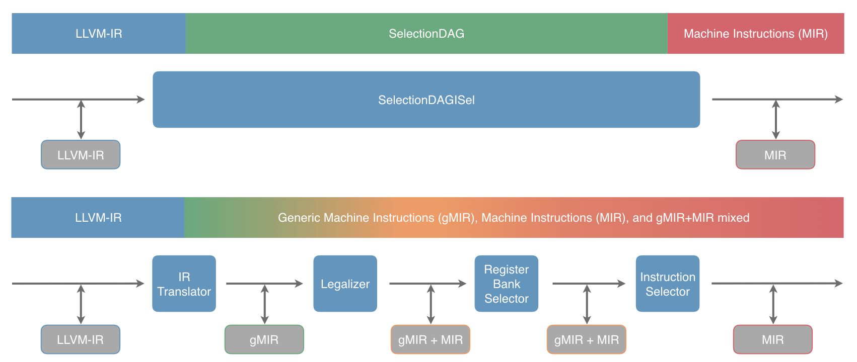 Converts LLVM-IR into gMIR (Generic MIR). This is largely a direct translation and has little target customization. It’s somewhat analogous to SelectionDAGBuilder but builds a flavour of MIR called gMIR instead of a specialized representation. gMIR uses exactly the same data structures as MIR but has more relaxed constraints. For example, a virtual register may be constrained to a particular type without also constraining it to a specific register class.